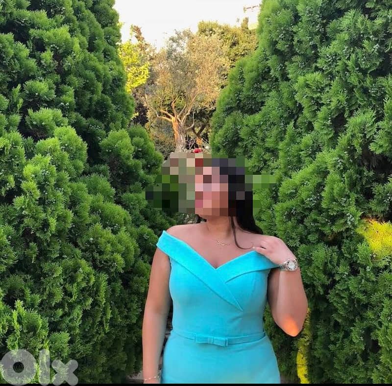 This is a beautiful turquoise dress, perfect for weddings or special events. It has an off-the-shoulder style and a nice bow at the waist. The dress is fitted and gives a very elegant look.