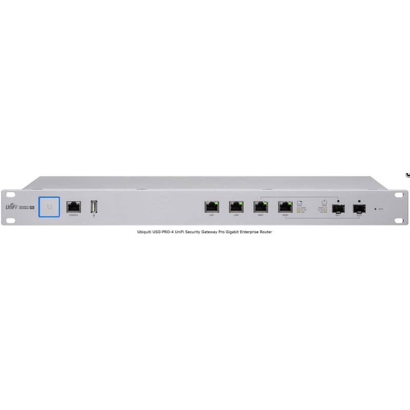 The Ubiquiti UniFi Security Gateway Pro (USG-PRO-4) is a rack-mountable enterprise-grade router designed for advanced network security, routing, and management. It features a 1 GHz dual-core processor, 2 GB DDR3 RAM, and four 1 Gbps ports (two RJ45, two combo SFP/RJ45), delivering up to 4 Gbps routing performance.