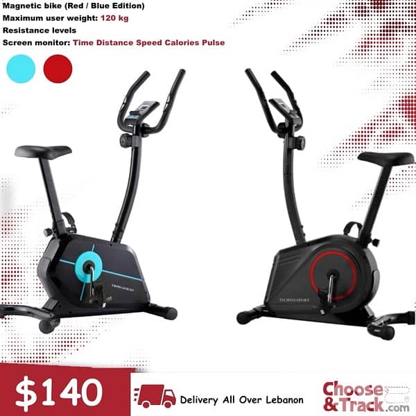 Magnetic bike (Red / Blue Edition) Maximum user weight: 120 kg Resistance levels Screen monitor: Time Distance Speed Calories Pulse Price: 140$ Delivery and Assembly available all over Lebanon Kindly Contact us or Whatsapp on 70406003