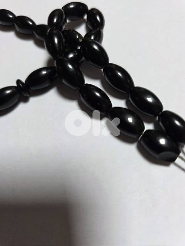 Elegant traditional misbaha featuring large glossy black oval beads with classic hand-strung construction.