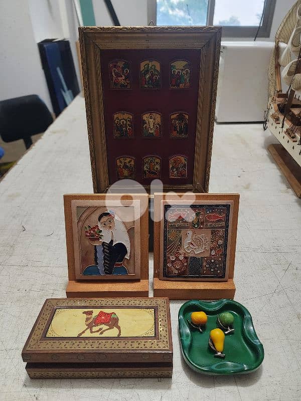 Mixed lot of decorative items sold together. Includes a framed religious icon panel, two small framed art pieces, a decorative wooden box, and a small dish with fruit ornaments. All items are in good condition. Sold as one lot for 35$. 71560016