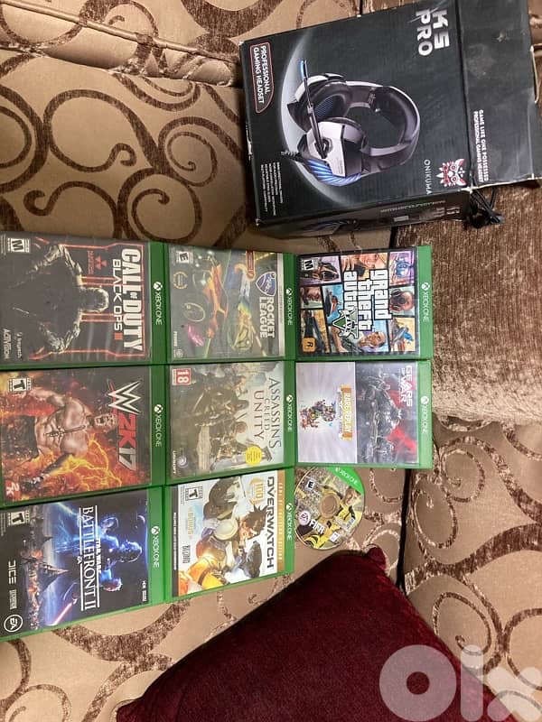 10 games one gaming headphone that works on console and pc 2 controllers one is barely used and the other with fixable problem her adapter hdmi cable the console is in a very good condition just needs some cleaning 1000gb