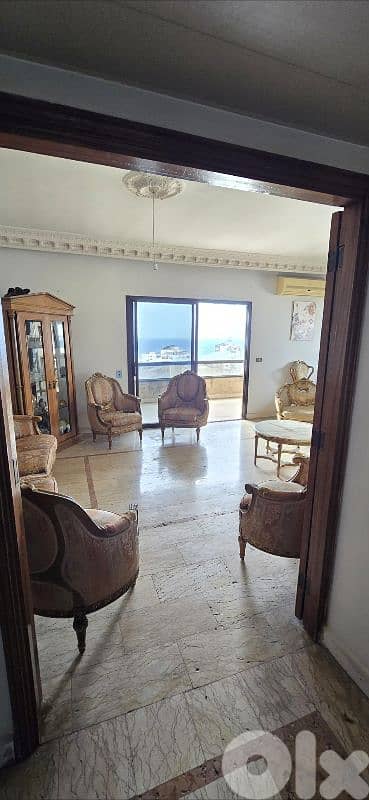 شقة واسعة بمساحة 240 م² تقع في الطابق الثامن، تتميز بإطلالة بانورامية خلّابة على البحر، المطار، والجبل.