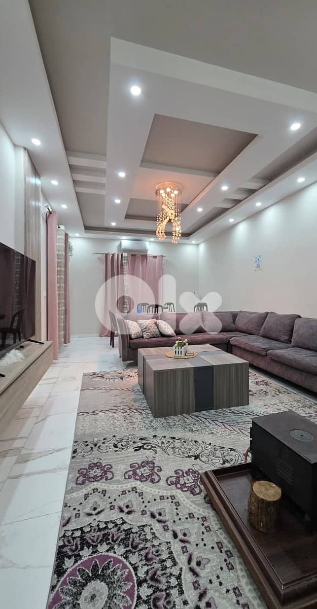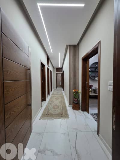 تتألف الشقة من صالون و سفرة مع تراس كاشف الجبل و ديكورات جفصين عامة في كامل الشقة و إنارة مخفية، مطبخ كبير، غرفة غسيل، حمام ضيوف و ثلاث غرف نوم مع حمام مشترك و شرفة.