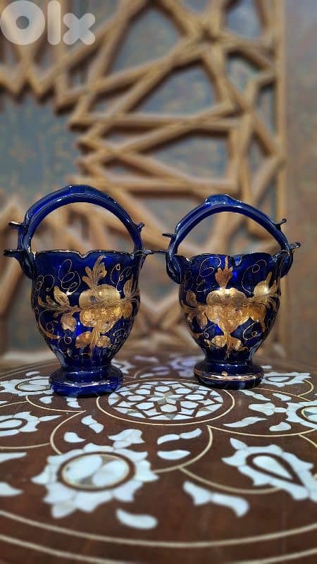 أضف لمسة من الفخامة التاريخية إلى مقتنياتك مع هذا الزوج النادر من السلال الزجاجية المنفوخة يدوياً بلون أزرق الكوبالت الملكي العميق. تجسد هذه القطع قمة الإبداع الأوروبي في منتصف القرن الماضي، حيث تزدان بنقوش نباتية بارزة مشغولة يدوياً بماء الذهب عيار 24 قيراطاً. تتميز السلال بحوافها المتموجة المتقنة ومقابضها ذات الملمس العتيق، مما يعكس سحر فن 'مورانو' العريق ولمسات 'بوهيميا' الكلاسيكية. ببريقها الأخاذ وحالتها المثالية، تعد هذه التحف قطعاً استثمارية استثنائية وجوهرة تتوج مجموعات الباحثين عن التميز والرقي.