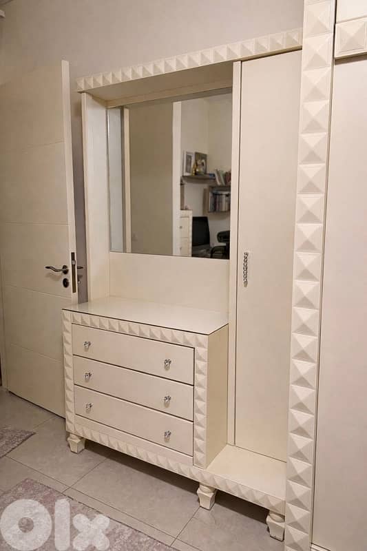 غرفه نوم لون ابيض مع: تخت مفرد 200*110مع تخت جارور + الفرشه كوموندينا شفنيراه مع خزانه زغيره للمكياج واربع جوارير خزانه 175*240 جرار مع ٣ درف خزانه زغره مع ٥ جوارير