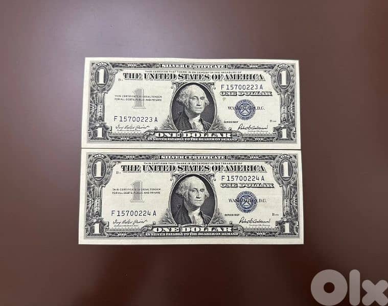 1$ blue seal date 1957 consecutive 2 pieces about unc