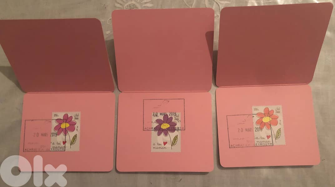 3 Souvenir Cards Rose Purple Orange Flowers Stamps Mother’s day Lebanon 2019 Delivery only at Achrafieh, Beirut Lebanon. التسليم فقط في بيروت الأشرفبة