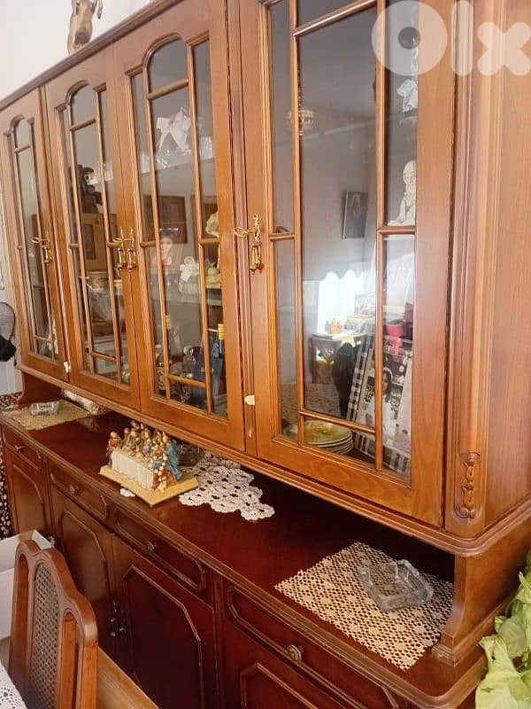 طاولة خشب زين بتفتح بالنص زيادة مع ١٠ كراسي و الخزانة طابقين الي وراها ٤ درف فوق و تحت مع جوارير ٣٥٠$