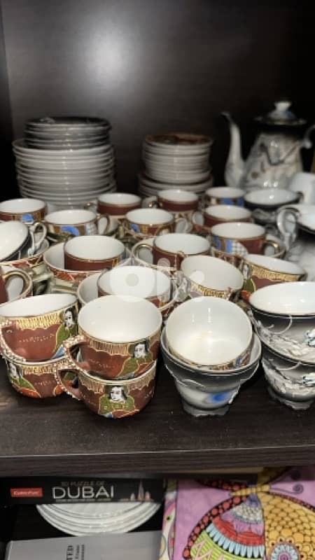 هذه مجموعة أكواب وصحون شاي يابانية، يبدو أنها من طراز كوتاني (Kutani ware).