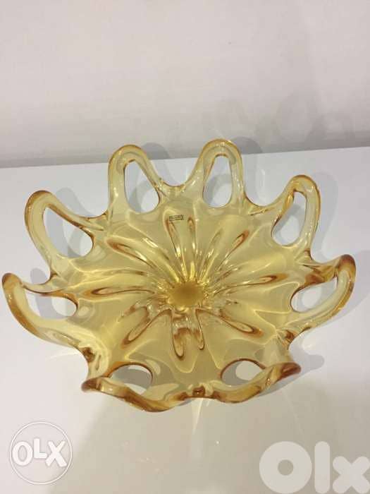 Antique mid century egerman yellow hand made cristal center table plate size 35 cm beautifully executed still new with tag even though it is over 60 years of age.