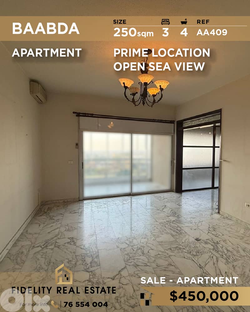 A 250 SQM apartment for sale in Baabda AA409 Located in a prime location 2nd floor This apartment consists of: -3 Bedrooms (1 master) -4 Bathroom -Living room -Dining room -Sitting room -4 Balconies -Maid's room + bathroom Amenities: -1 Parking spot -Open sea view -Elevator -Electricity -Concierge REF: AA409 Price: 450,000$ + 2.5% commission fees Contact us on: +961 76 554 004 شقة بمساحة ٢٥٠ مترًا مربعًا للبيع في بعبدا AA409 موقع مميز الطابق الثاني تتكون الشقة من: ٣ غرف نوم (غرفة نوم رئيسية) ٤ حمامات غرفة معيشة غرفة طعام غرفة جلوس ٤ شرفات غرفة خادمة مع حمام المرافق: موقف سيارة واحد إطلالة بانورامية على البحر مصعد كهرباء خدمة الاستقبال والإرشاد المرجع: AA409 السعر: ٤٥٠,٠٠٠ دولار أمريكي + ٢. ٥٪ عمولة للتواصل: ٧٦٥٥٤٠٠٤