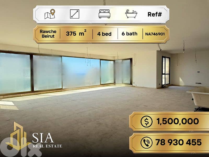 استمتع بأقصى درجات الراحة والأناقة في هذه الشقة الفسيحة بمساحة 375 مترًا مربعًا، الواقعة في قلب الروشة، في موقع مميز بإطلالات بحرية مفتوحة.