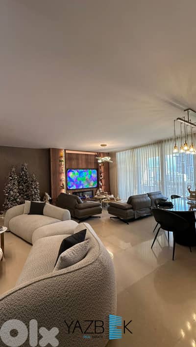 شقة بمساحة ١٦٣ مترًا مربعًا بإطلالة بانورامية على البحر ومدينة بيروت. تتكون من: