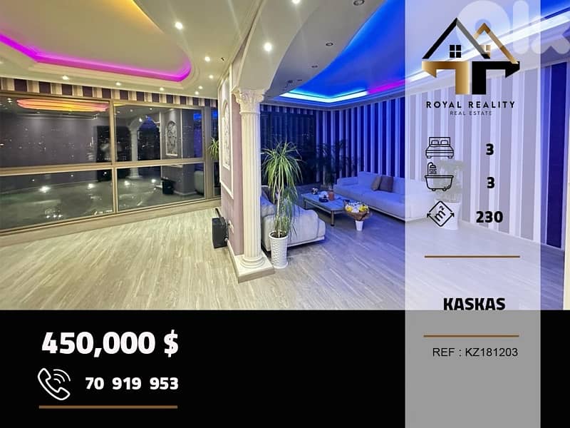 High-Floor Living in KASKAS A 230 sqm brand-new apartment for sale in the heart of kaskas, set on a high floor offering openness, light, and prestige. A perfect blend of modern design and prime location—ideal for refined city living or a smart investment. This 230 sqm apartment consist of * 1 master bedroom * 2 regular bedrooms * 3 bathrooms * Living room * Dinning room * Kitchen More features: * Prime location * Brand New building * Brand New apartment * City view * Storage room * Concierge * 14th floor Price 450,000 $ + 2.5% commission Contact us at 70 919953 Ref:KZ181203
