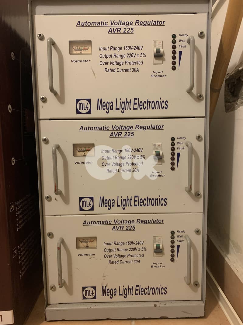 3 X 30 A Input range 160V - 240V Output Range 220 +-5% Over Voltage Protected Rated Current 30A Manufacturer: Mega Light Electronics Used for couple year before switching to monophase