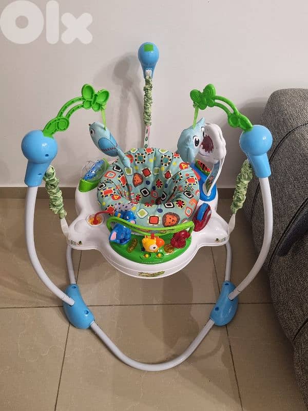 Baby jumper with lights, sounds, and music rewards every bounce.