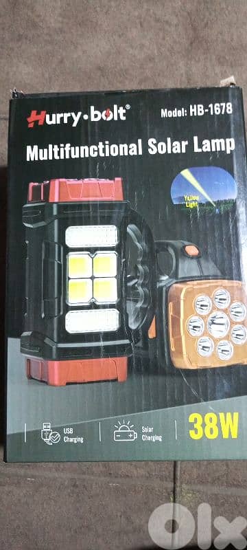 هذا الضوء بقدرة 38W هو خيار رائع جداً، حيث يضم أربع إضاءات مميزة: ضوء أبيض، وضوء أصفر، بالإضافة إلى ضوءين أبيضين على الجانبين. ومن الجهة الأخرى، يحتوي على لوحة طاقة شمسية للشحن، كما يتضمن منفذ USB لشحن الهواتف.