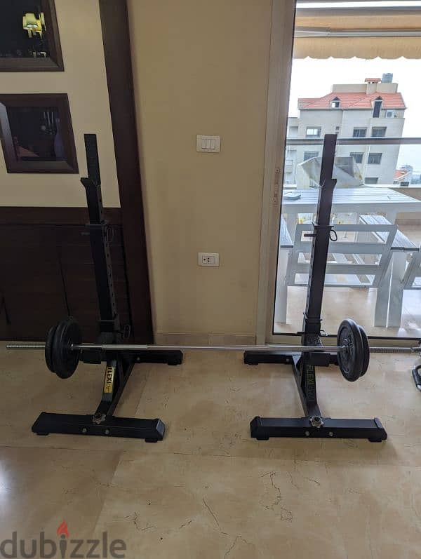 the items are : barbell (10 kg), 2 pair of 1 kg, 2 kg, 4 kg, 6 kg and 15 kg dumbell, 1 pair of adjustable dumbbell, adjustable rack ( can be used for squat, incline bench press, decline bench press, bench press, shoulder press, squat and other exercises), about 60 kgs in plates and a pair of leg weights.