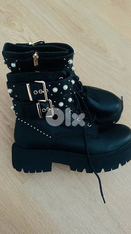• Features: Chunky lug sole, gold-tone buckles, faux-pearl and stud embellishments.