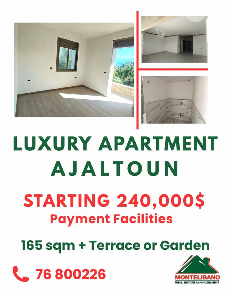 Brand New 165 sqm Luxury Apartment For Sale in Ajaltoun (عجلتون) with Terrace or Garden + Payment Facilities