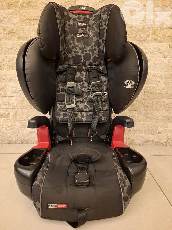 Safety, comfort and convenience make the Pinnacle ClickTight an exceptional Harness-2-Booster Seat. Car seat installation is easy as buckling a seatbelt thanks to the ClickTight Installation System. In the Pinnacle Harness-2-Booster Car Seat you are surrounded in safety. This booster seat features the patented Britax SafeCell Impact Protection system which includes a steel frame, energy-absorbing base, V-shaped tether to minimize seat rotation and staged-release stitches that slow and reduce forward movement in the event of a crash. Britax designed the Pinnacle ClickTight Seat with three strong layers of side energy absorption; a deep foam-lined shell, head protection, and external cushions will shield your child from the most severe type of collision. Two integrated cup holders keep drinks and snacks within reach and are easy to clean between rides. The 9-position quick-adjust harness grows along with your child and it's easy to transition from a harness to a belt-positioning booster by tucking the buckles and straps within the seat. The Pinnacle ClickTight Harness-2-Booster Seat can be used in Harness Mode for children 2 years old and 25 to 90 lbs. or in Booster Mode for children 40 to 120 lbs. Child standing height using the harness 30-58” and using booster mode 45-62”. Dimensions minimum 22.5 W x 28 H x 21 D, maximum 22.5 W x 36 H x 21 D inches. Seat width 12”. 9-Position harness slot heights 12.5” to 20.5”. May not be compatible with all vehicles, see user guide.