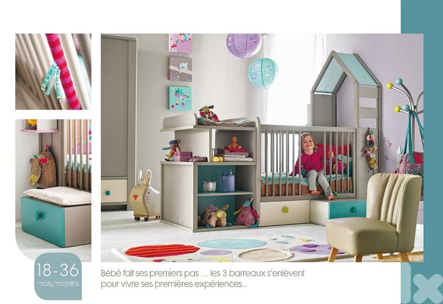Gautier made in France, complete baby bedroom with bed 70x140 cm + 1hut and headboard + 3 storage niche + 2 storage drawers + 1 changing mat