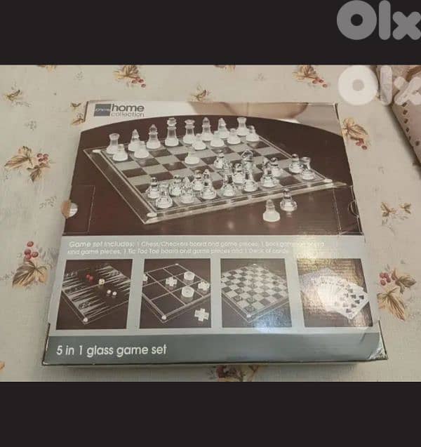 لعبة شطرنج ولعبة نرد وغيرها،، ٥ العاب في علبة واحدة . قطعة مميزة من الواح الزجاج. حالة ممتازة.