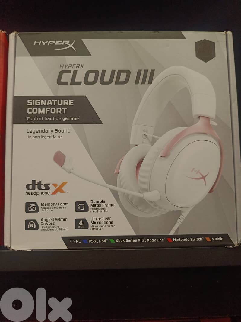 سماعة الألعاب HyperX Cloud III باللون الأبيض — تصميم أنيق وجذاب ، راحة عالية بوسائد الذاكرة (Memory Foam) لجلسات لعب طويلة بدون تعب، مع محركات 53 مم لصوت واضح وديناميكي . فيها ميكروفون واضح وقابل للفصل مع مؤشر LED للكتم، وتوافق واسع مع الكمبيوتر وأجهزة الألعاب (PS/Xbox/Switch) وحتى الموبايل . تقنية DTS Spatial Audio للصوت المحيطي الغامر (عند التوصيل عبر USB) تزيدك في التجربة الصوتية!