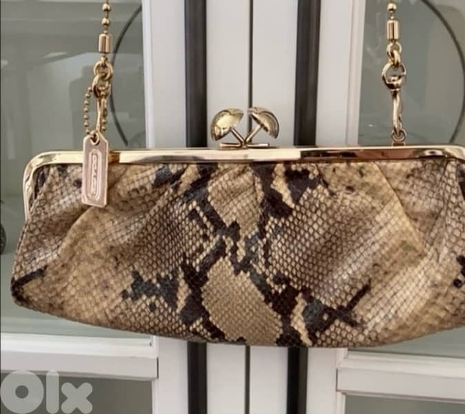 C. o. a. c. h. A. man. d. a Darcy Kisslock Chain Clutch. This vintage-inspired piece features a snakeskin-embossed or python exterior, a distinctive oversized gold tone kiss lock closure size 30 cm x 13 cm