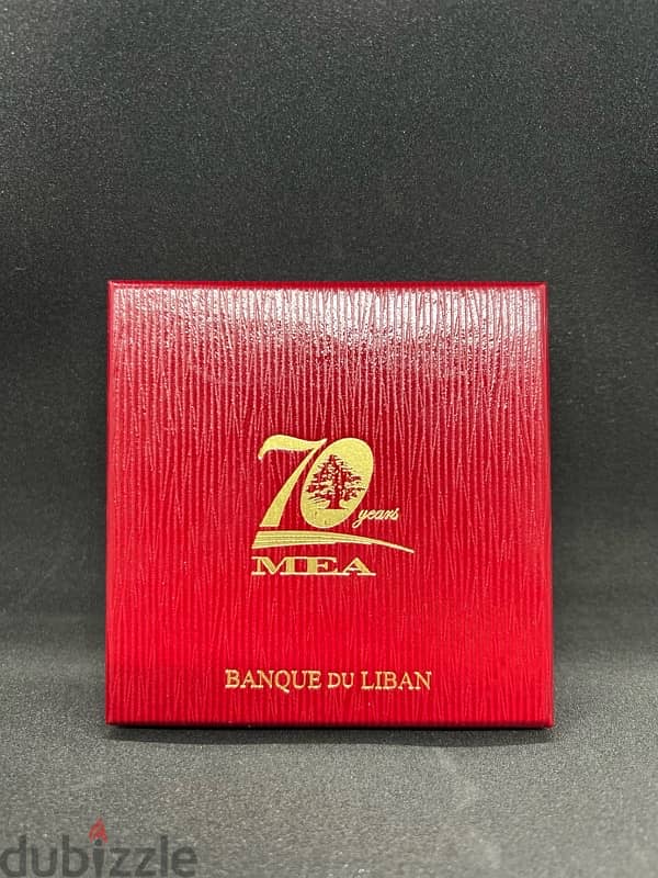 -Box with a textured red finish and gold embossed text, featuring the “70 years” MEA logo, along with the Banque du Liban branding.