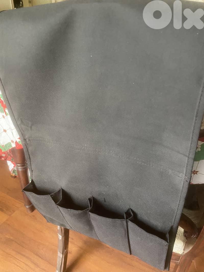 IKEA black sofa armrest organizer with 4 pockets and a weighted rod to keep it securely in place. Perfect for remotes, phones, and small essentials.
