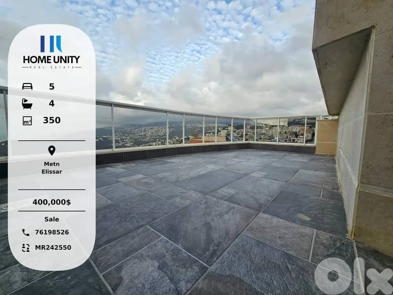 This 350 sqm 5-bedroom duplex, including 1 master bedroom is available for sale in Elissar, Metn, the property features 4 bathroom(s). The property includes 3 parking spaces. and is situated in a modern building. Current condition of the property is Ready to move in.