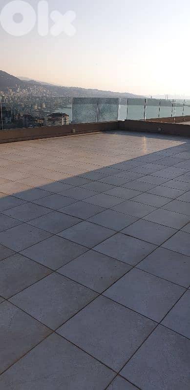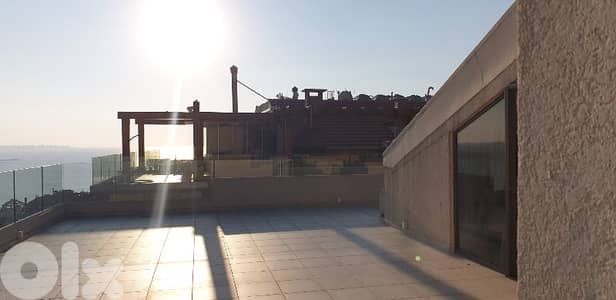 A duplex in Adma, overlooking the entire bay and sea, as well as the Green Mountain. For lovers of unobstructed views, the duplex spans 500 square meters. It comprises four master bedrooms, a jacuzzi, seven bathrooms, two kitchens, several living rooms and salons, a maid's room with its own bathroom, and a very large terrace in a prime location, as if you were on the 20th floor. This is for those who appreciate unobstructed views, as half of the upper floor is a terrace. A wooden and glass pergola, similar to one in a neighboring property, and a barbecue are available, in addition to three underground parking spaces and a cafe. Note: The living rooms and bedrooms feature natural Italian stone tiles, and all doors, including those in the bedrooms, are made of oak. The first and second kitchens are ready for use, constructed of oak, and equipped with all electrical appliances, including an oven, gas stove, microwave, and hob, as well as full AC, central air conditioning, and a heating system with a generator and burner. The ceilings feature gypsum decoration. Note: The duplex is currently divided into two apartments; the internal staircase can be re-entered during the renovation. In short, a distinctive duplex in a strategic location. The price is reasonable for serious buyers.