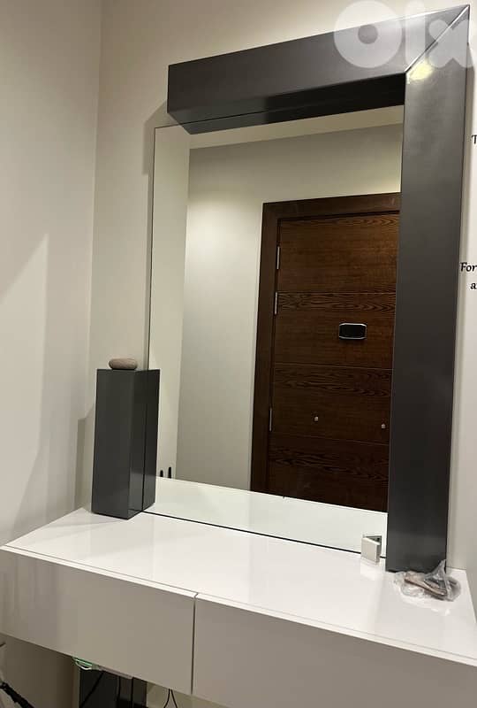 gray and white wood with 2 drawers and big mirror