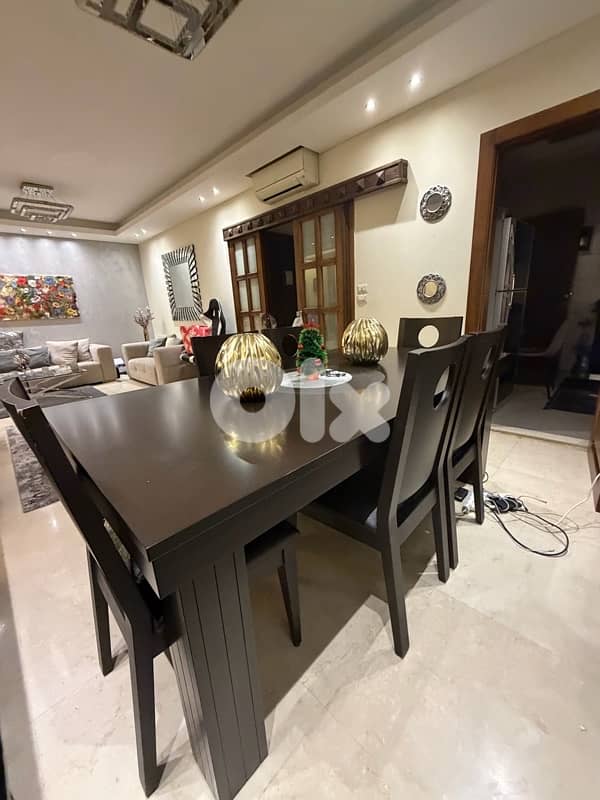 A dining room with a table plus six chairs, made of wood and leather, for sale, and also a cabinet with a mirror translate