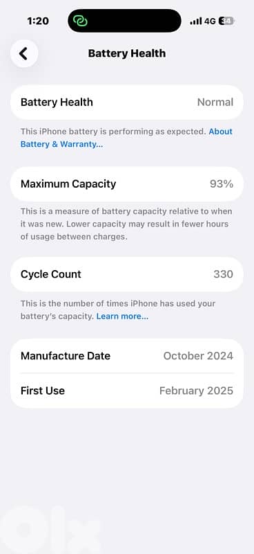 iphone 16 pro 256 gb no scratch cycle count 330 battery 93%