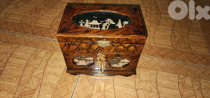 an antique jewelry box with top compartment, and 2 drawer. it has a very nice design and color