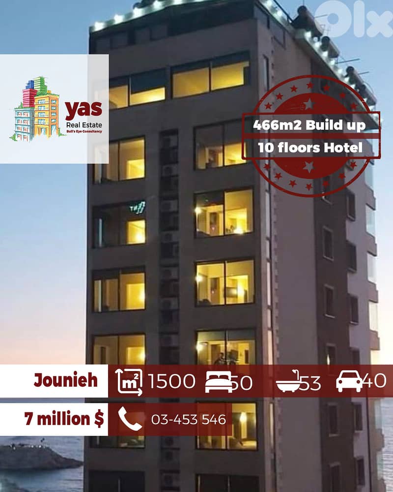 Nestled in a super prime location in Jounieh, this fully operational hotel spans 466m² of built-up area on a generous 1,500m² plot. Designed for luxury and functionality, the property includes: