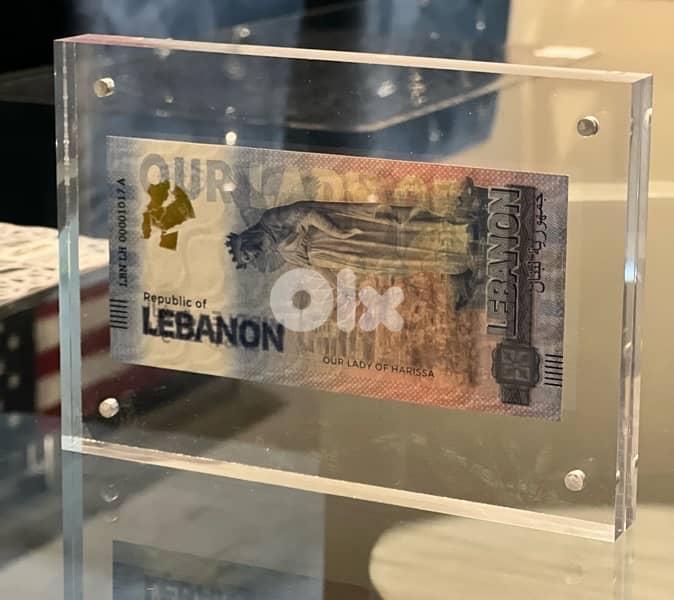 Lebanon Our Lady of Harissa, New Middle East Series Fantasy Banknote with serial number in thick magnetic plexi stand for only $35. لبنان ضمن مجموعة عملات الشرق الأوسط، سيدة حاريصا ، في برواز شفاف فقط $٣٥
