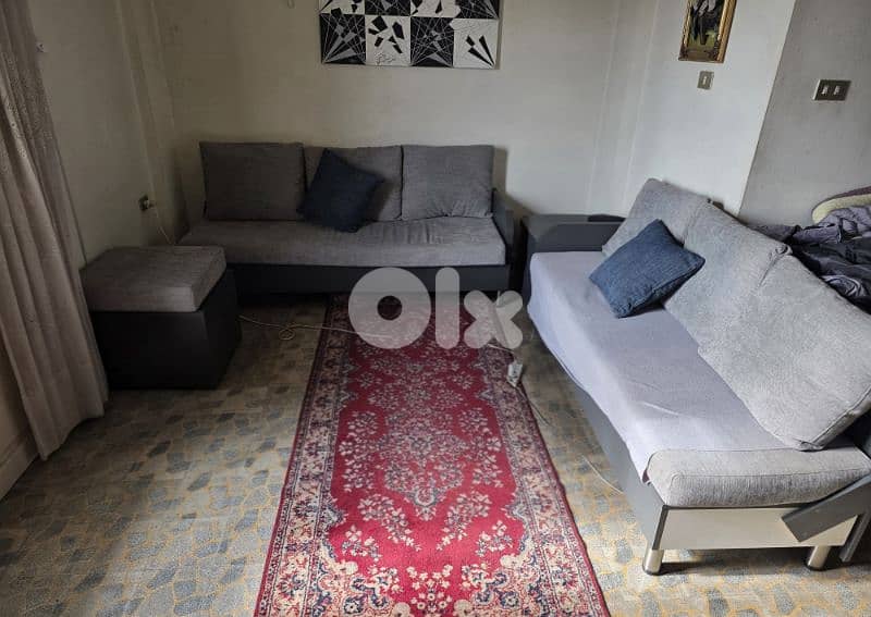 Comfortable modern living room set including two sofas and one matching ottoman/footrest and one table. The set features a neutral grey fabric that fits easily with most home styles and provides a cozy seating space for a living room or lounge area.
