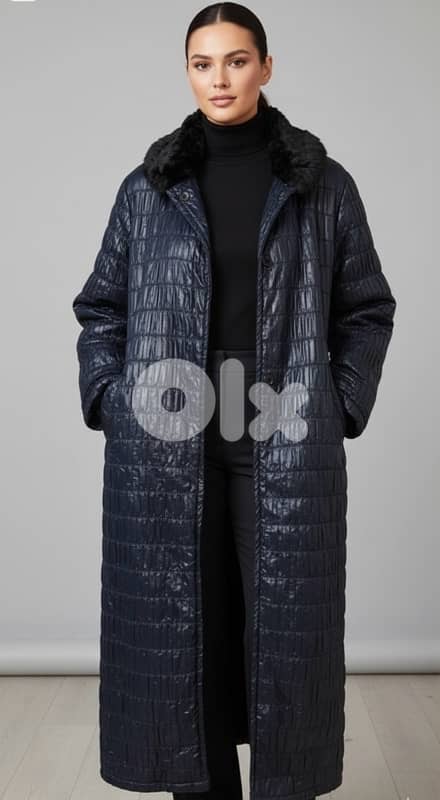 long black quilted coat with fur inside