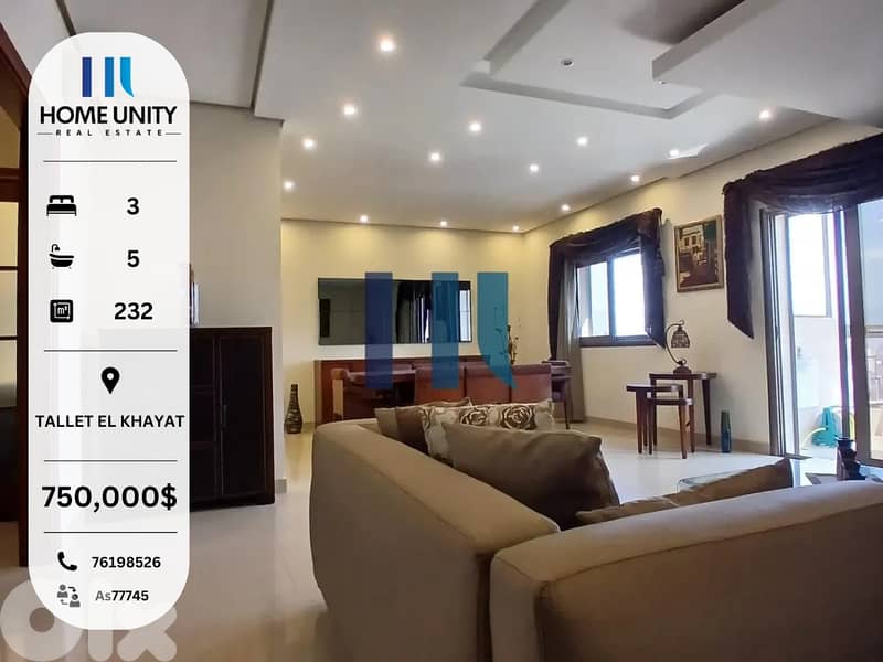 This 232 sqm 3-bedroom appartment is available for sale in Tallet el Khayat, Beirut, Beirut. Located on the 10th floor, the property features :