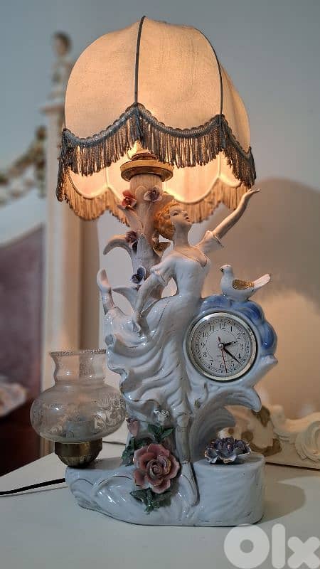 Elevate your space with this magnificent vintage porcelain lamp, a true work of art from the mid-20th century. This captivating piece showcases a stunningly detailed figurine of a graceful dancer, crafted from exquisite porcelain with biscuit accents that give her a soft, matte finish. The lamp base is a tapestry of delicate, hand-painted flowers, and nestled within its flowing form is a charming analog clock, making it as functional as it is beautiful. Topped with a classic fringed lampshade, this unique lamp casts a warm, inviting glow, creating an atmosphere of unparalleled elegance and timeless romance. It's not just a lamp; it's a conversation starter, a piece of history, and a magnificent focal point for any room.
