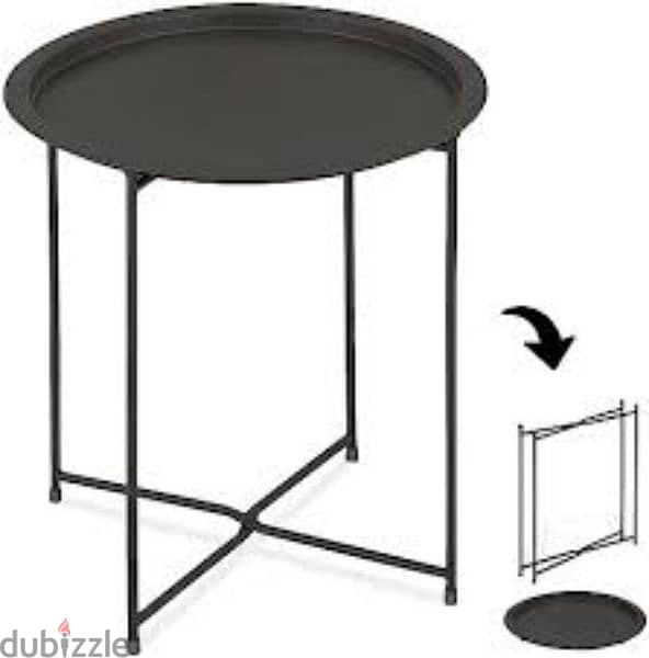 Foldable metal table with removable tray trop Dimensions: H 52cm, Diameter 46.2 cm Tube size: 13x13x0.6 mm Color: Dark grey