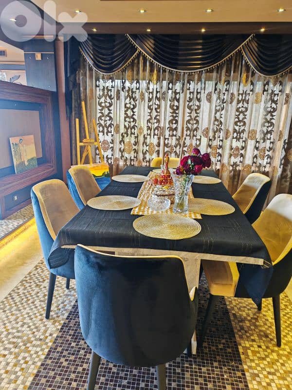 Elegant dining table with 6 comfortable velvet chairs in a beautiful blue and beige combination. A perfect statement piece for any dining room.
