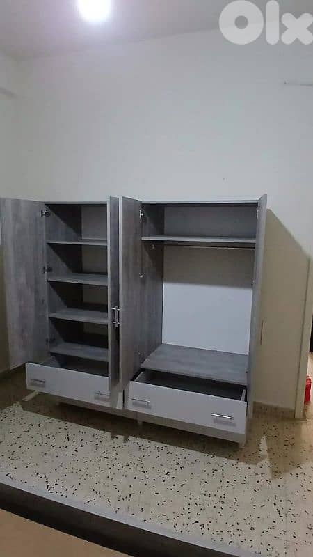 مألفة من خزانة 4 درف عرض 160 أو 180 إرتفاع 190 غمق 47 ملبسة من جوى , و تخت مجوز مع جارورين عرض 170 طول أستندر 200 و 2 كومود 40×40 و شفنيرة مع مراية عرض 80 إرتفاع 79 غمق 37 سكك تلسكوب مفصلات سوفت كلوس تقشيط مكنة pvc مع إمكانية تغيير اللون حسب الطلب