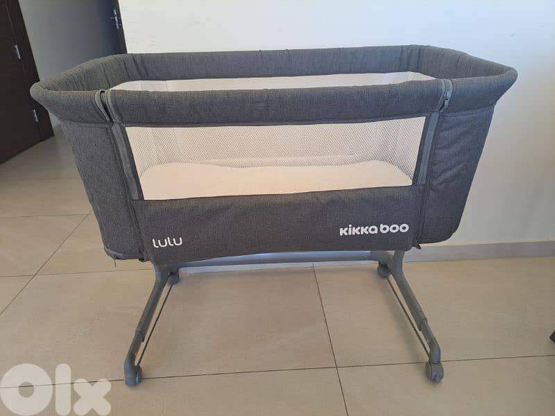 Adjustable next to me crib, brand: kikka boo, color: grey, with 2 bedsheets (white, blue) and 2 mattress covers