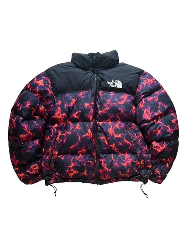 Authentic The North Face puffer jacket featuring a striking lava-style print in red, orange, and black. Excellent insulation, durable outer shell, and iconic branding.