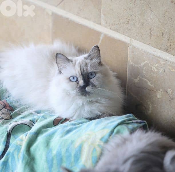 Stunning pure white female kitten with crystal blue eyes, born from a Siberian–Chinchilla mother and Himalayan father. She has a soft, fluffy coat, strong build, and a naturally elegant presence.